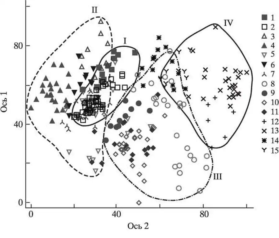 I - Rhodobryo-Piceetum typicum (1, 2), II - Rhodobryo-Piceetum caricetosum pilosae (3-7), III - Rhodobryo-Piceetum abietetosum sibiricae (5-11), IV - Tilio-Piceetum obovatae (12-15). Номера участков соответствуют рисунку и таблице. Оси 1 и 2 - абстрактные оси варьирования.