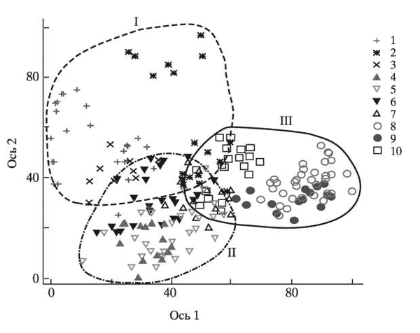 Оси 1 и 2 - абстрактные оси варьирования.