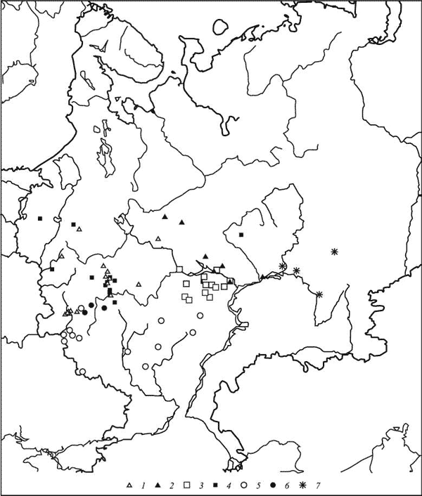 Обозначения: 1,2- хвойно-широколиственные леса двух субассоциаций в составе Rhodobryo-Piceetum abietis; 3,4 - широколиственные леса ассоциации Ouerco-Tilietum cordatae; 5,6- широколиственные леса ассоциации Aceri campestris-Quercetum; 7 - хвойно-широколиственные леса ассоциации Tilio-Piceetum obovatae.