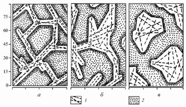 а - в хвойно-мелколиственных, б - в хвойно-широколиственных, в - в широколиственных лесах; 1 - окна, 2 - сомкнутые участки леса.