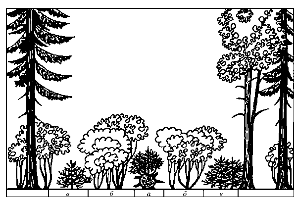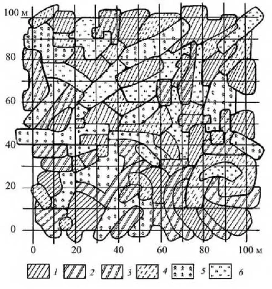 1 - еловая парцелла; 2 - пихтовая парцелла; 3 - липовая парцелла; 4 - мелколиственная парцелла; 5 - окна на месте хвойных парцелл; 6 - окна на месте лиственных парцелл.