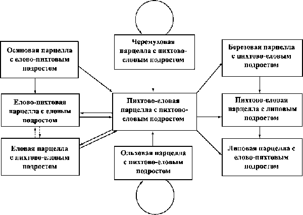Схема циклов развития парцелл в хвойно-широколиственных лесах Сабарского заказника (Самохина, 1997).