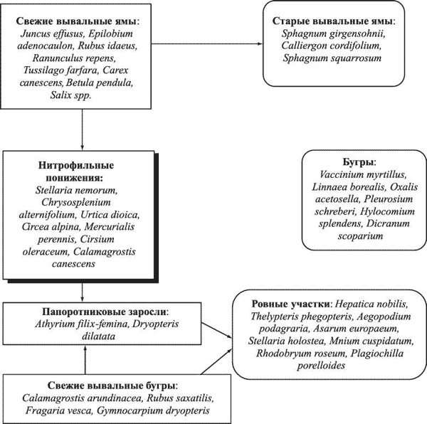 Стадия 4 - “окончание гумификации” (20-25 лет после падения ствола). Нижняя часть разложившейся колоды слабо отличима от гумусового горизонта, лишь верхний слой (мощность 10-15 см) имеет структуру слежавшейся подстилки. Ксилотрофные макромицеты отсутствуют. Общее проективное покрытие (15-20%) и набор видов мхов меньше, чем на предыдущей стадии. Наряду с Plagiomnium cuspidatum доминируют P. medium и Mnium stellare, на боковых сторонах колоды развивается Plagiothecium laetum, окончательно выпадают эпифитные виды. Всего на этой стадии отмечено 22 вида мхов. Из сосудистых растений на этой стадии присутствуют имматурные особи ели (проективное покрытие до 25%), продолжается развитие особей указанных выше деревьев и кустарников. Бореальное мелкотравье начинают вытеснять крупные папоротники - Dryopteris expansa, D. cartusiana (их проективное покрытие до 10-15%), доминирующая роль кислицы снижается (проективное покрытие не более 10%). Появляются Carex rhizina и всходы Rubus idaeus. Общее проективное покрытие яруса С не более 40-50%.