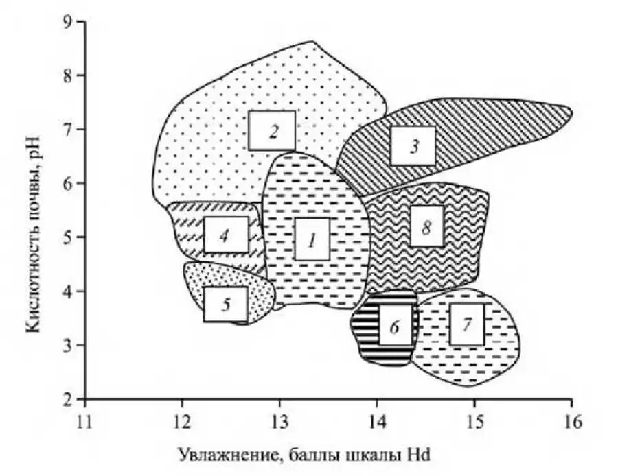Положение основных эколого-ценотических комплексов в пространстве факторов увлажнения и кислотности.