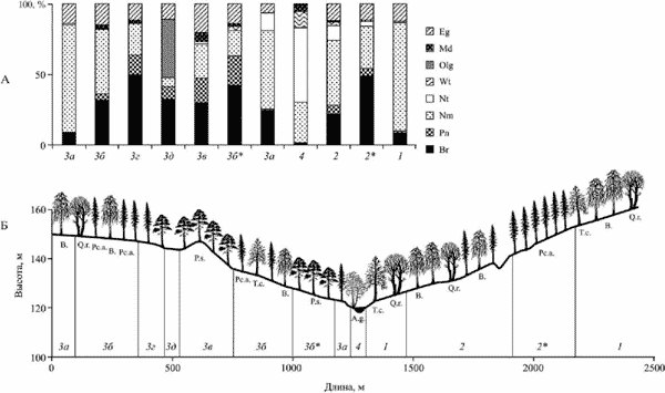 А - эколого-ценотические спектры сообществ в разных экотопах. Б - размещение экотопов по рельефу.