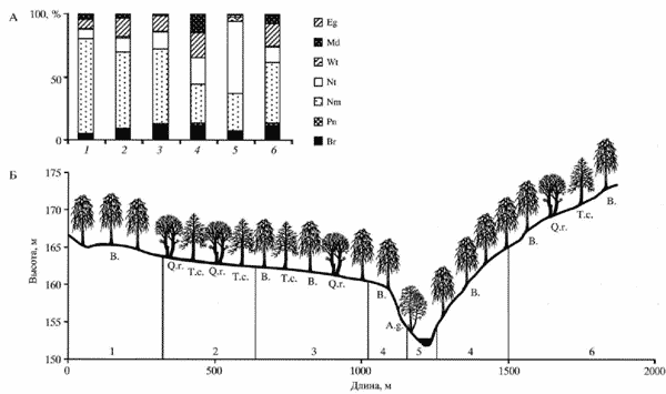 Б - размещение экотопов по рельефу. Буквенные обозначения видов деревьев эколого-ценотических групп.
