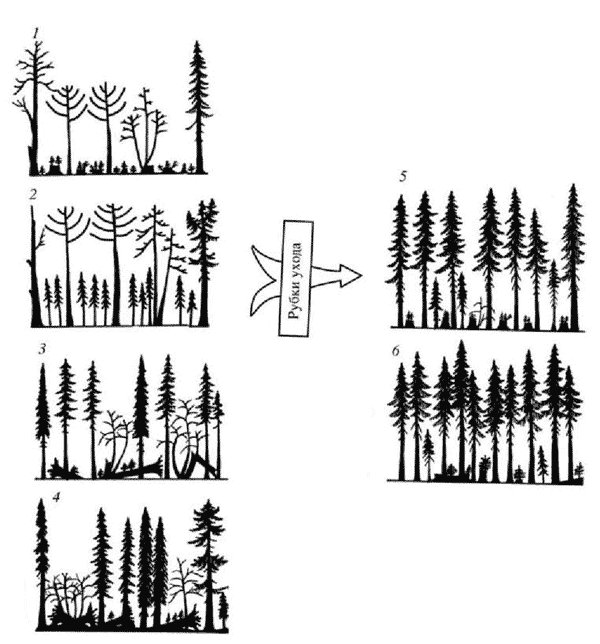 Схема восстановительной сукцессии в пихто-липо-ельниках после узколесосечной вырубки с сохранением порубочных остатков (7—4) и результаты рубок ухода (5-6).