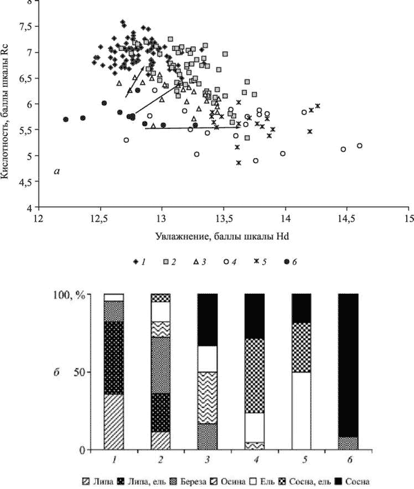 Ассоциации: 1 - Querco-Tilietum cordatae, 2 - Rhodobryo rosei-Piceetum abietis, 3 - Querco-Pinetum; 4 - Vaccinio myrtilli-Pinetum, 5 - Maianthemo bifolii-Piceetum abietis, 6 - Vaccinio vitis-idaeae-Pinetum.
