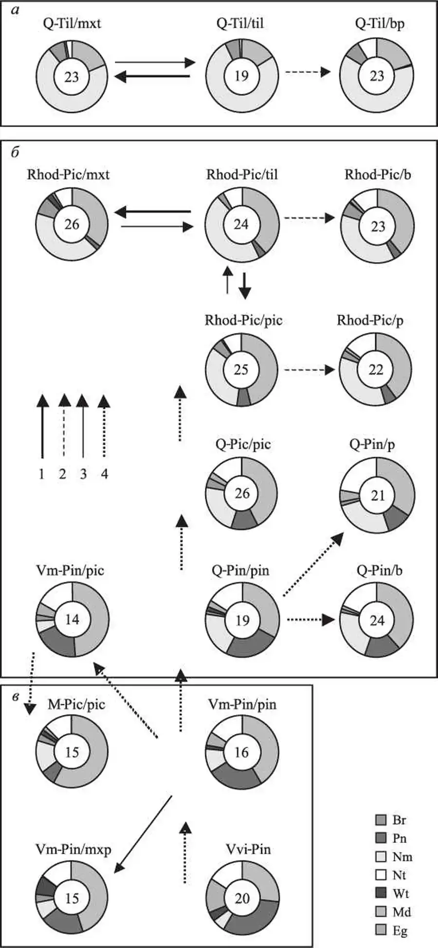 Стрелками показаны основные динамические тенденции в данной сукцессионной системе: 1 - усиление позиций ели и бореальных видов; 2 - смена доминирования на мелколиственные породы; 3 - усиление позиций широколиственных пород и неморальных видов; 4 - ослабление роли боровых видов и усиление позиций неморальных.