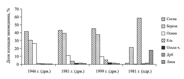 Изменение доли площадей, на которых преобладают разные виды деревьев в древостое (дрв.) и в подросте (пдр.), в лесном массиве Приокско-Террасного заповедника с 1946 по 1999 год (Ольха ч. - ольха черная).