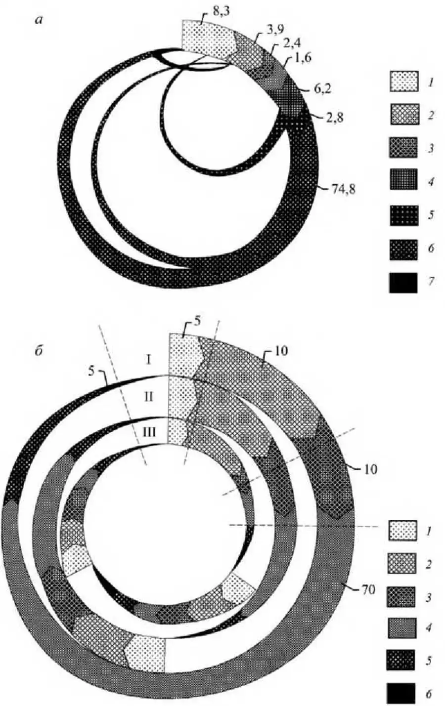 б - популяционные локусы разных широколиственных деревьев, в которых господствуют особи следующих онтогенетических состояний: 1 - im, 2 - v, 3 - g1, 4 - g2, 5 - g3, 6 -s. I -цикл поколения дуба; II - циклы поколений ясеня, клена остролистного, явора, липы сердцевидной, III - циклы поколений клена полевого, граба обыкновенного. Цифры - процент занимаемой в ценозе площади многовидовых парцелл; пунктир - временные границы многовидовых парцелл.