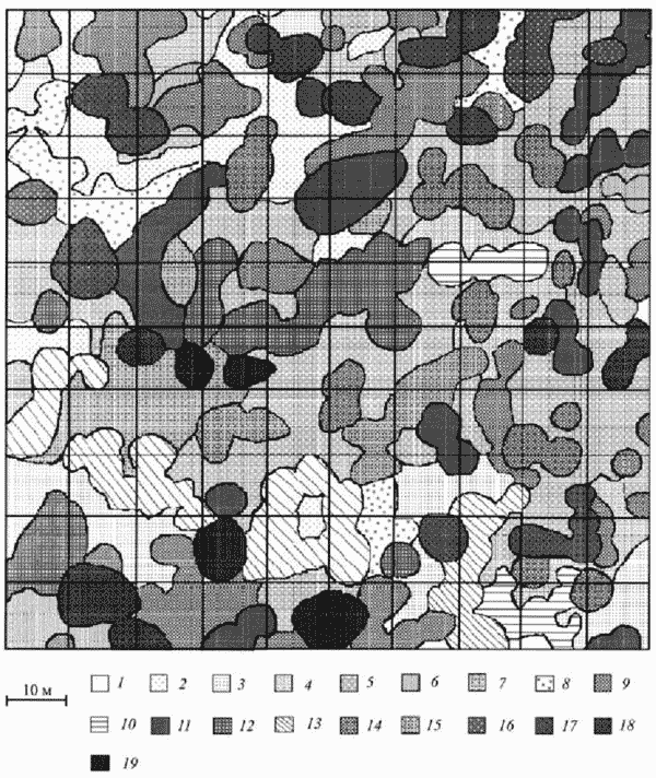 Возрастные парцеллы: 1 - 1-5 лет, имматурные особи; 2 - 5-10 лет, имматурные особи; 3 - 10-20 лет, имматурные особи; 4 - 20-40 лет, имматурные особи второй подгруппы и виргинильные первой подгруппы; 5 - 40-60 лет, виргинильные особи; 6 - 50-70 лет, виргинильные особи; 7 - 60-80 лет, молодые генеративные особи; 8 - 70-90 лет, молодые и средневозрастные генеративные особи; 9 - 80-100 лет, молодые и средневозрастные генеративные особи; 10 - 90-110 лет, молодые и средневозрастные генеративные особи; 11 - 100— 120 лет, средневозрастные и старые генеративные особи; 12 - 110-130 лет, средневозрастные и старые генеративные особи; 13 - 130-150 лет, старые генеративные особи; 14 - 120-140 лет, старые генеративные особи; 15 - 140-160 лет, генеративные особи; 16 - 160-180 лет, старые генеративные особи; 17 - 180-200 лет, старые генеративные особи; 18 — 200-220 лет, старые генеративные особи; 19 - 220-240 лет, старые генеративные особи.