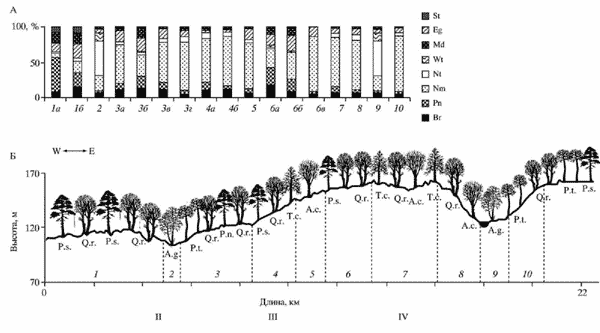 Схема катены и распределение лесного покрова на территории Воронежского заповедника. А - эколого-ценотические спектры сообществ; Б - размещение экотопов по рельефу. Обозначения видов деревьев см. на рисунке.