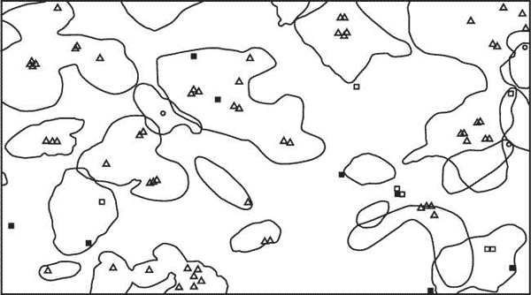 Распределение проекций крон и оснований стволов деревьев третьего яруса в западной части постоянной пробной площади № 10 в 2001 г. Показаны контуры крон липы; значками - основания стволов живых деревьев. Основания стволов сухостойных деревьев отмечены зачерненными значками.