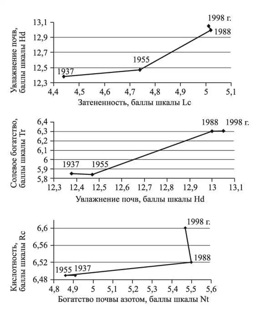 Динамика видового состава и структуры исследуемого растительного сообщества сопровождается изменением экологических характеристик местообитания, вычисленных по шкалам Д.Н. Цыганова.