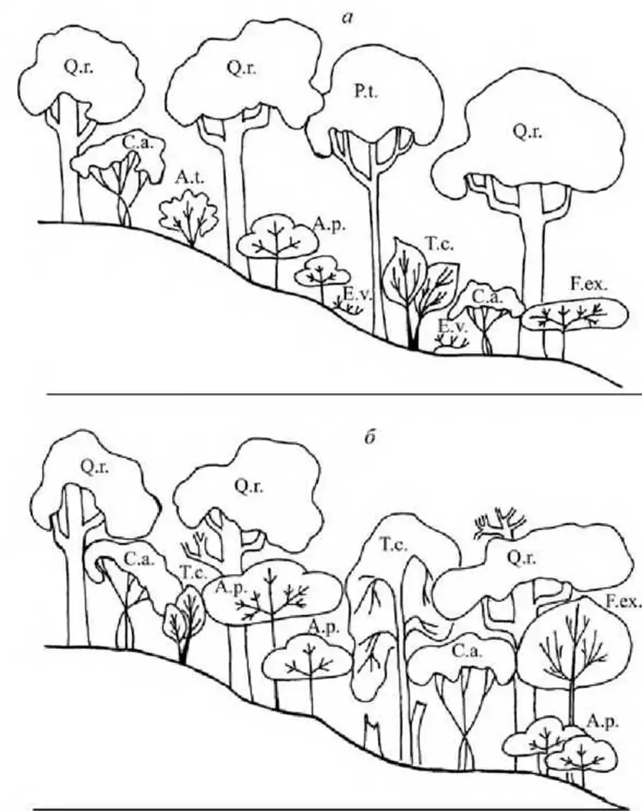 Схема ярусной структуры дубняков снытевых IV надпойменной террасы реки Воронеж и покато-ступенчатого уступа этой террасы по данным 1937 г. (а) и 2000 г. (б).