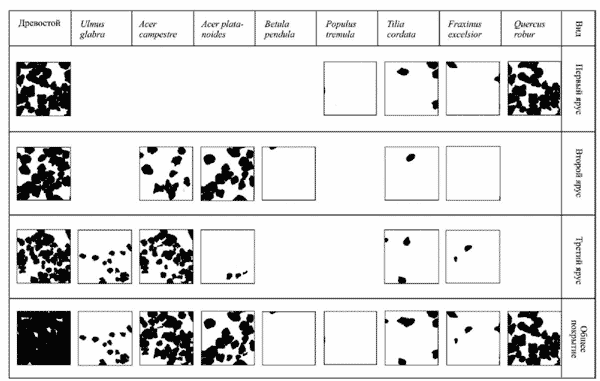 Третий ярус, как и второй, формируют пять видов: ясень, липа, клены остролистный и полевой, ильм. Из них на первые три приходится 68,4% проективного покрытия.