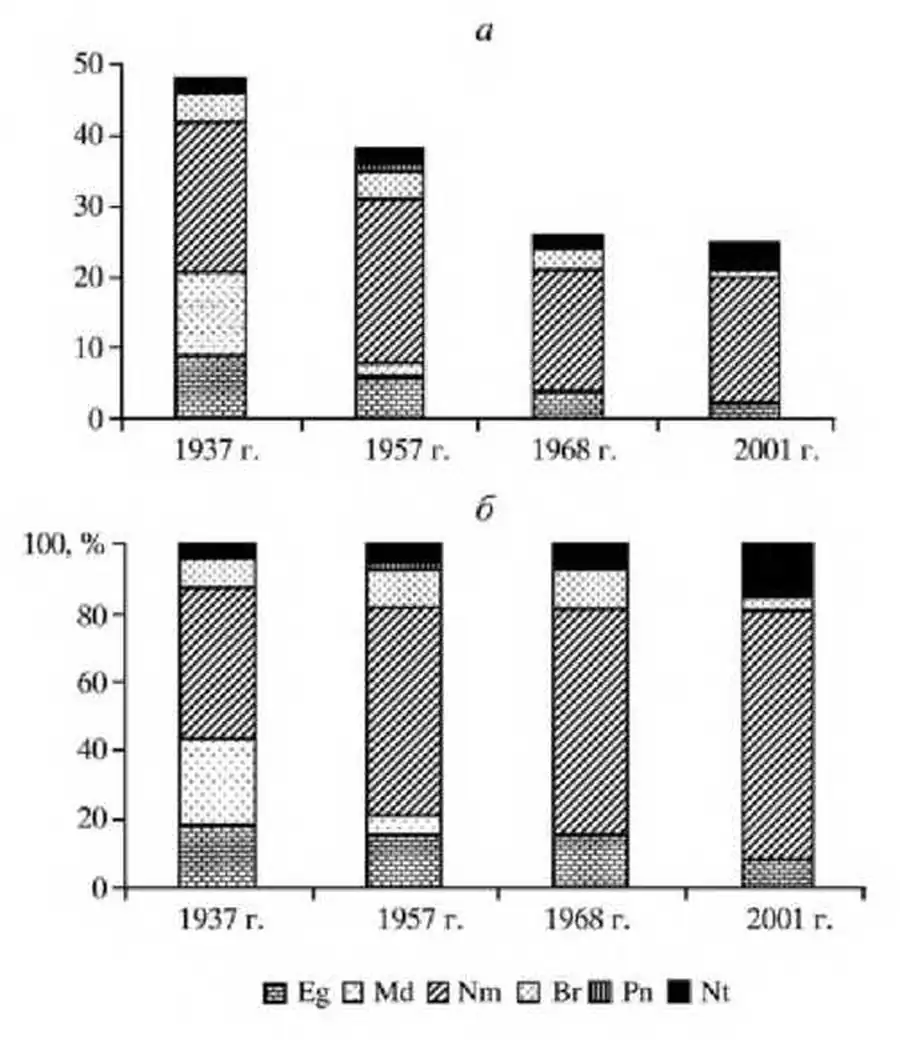 На протяжении 64 лет наблюдений в этом растительном сообществе (Хомякова, 1958; Ремезов, 1961; Молоткова, 1968) происходит постоянное снижение видового разнообразия. По сравнению с 1937 г. видовое богатство сократилось почти в два раза. Появился более теневыносливый вид - бересклет европейский. В травяном покрове полностью исчезли боровые, лугово-степные и бореальные виды; имеются потери и среди неморальных видов: выпадают более светолюбивые Melica nutans, Convallaria majalis, Carex digitata, C. pilosa; исчезают папоротники (Dryopteris carthusiana, D.filix-mas).