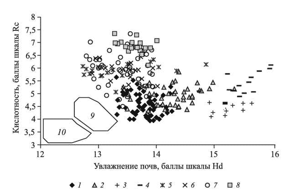 Группы ассоциаций: 1 - черничная; 2 - травяно-сфагновая; 3,4 - сфагновая; 5,6,7 - разнотравная; 8 - высокотравная; 9-10.