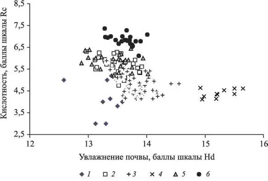 1 - субассоциация Cladonio-Pinetum vaccinietosum myrtilli, 2 - Vaccinio-Pinetum boreale, 3 -Eu-Piceetum abietis myrtilletosum, 4 - Oxycocco quadripetali-Pinetum, 5 - субассоциация Melico nutantis-Piceetum abietis typicum, 6 - ассоциация Melico nutantis-Piceetum abietis aconitetosum.