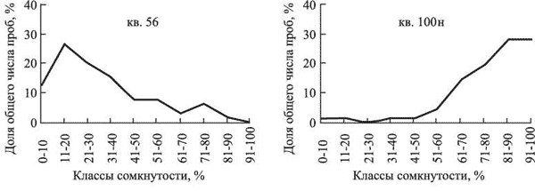 Распределение пробных площадей (круговых, радиусом 5 м) по классам сомкнутости древостоя (общей для ярусов А и В) для малонарушенной елово-пихтовой тайги (кв. 56 Усьвенского лесничества, слева) и для 64-летнего березняка по сплошной вырубке (кв. 100н Усьвенского лесничества, справа). Общее число проб в каждом случае 82.