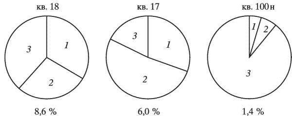 Распределение валежа по степеням разложения (7, 2, 3) и общее проективное покрытие валежа (%) в малонарушенном елово-пихтовом лесу (кв. 18 Усьвенского лесничества), на участке заброшенного в середине прошлого века сенокоса (кв. 17 Усьвенского лесничества) и в 64-летнем березняке по сплошной вырубке (кв. 100н Усьвенского лесничества).