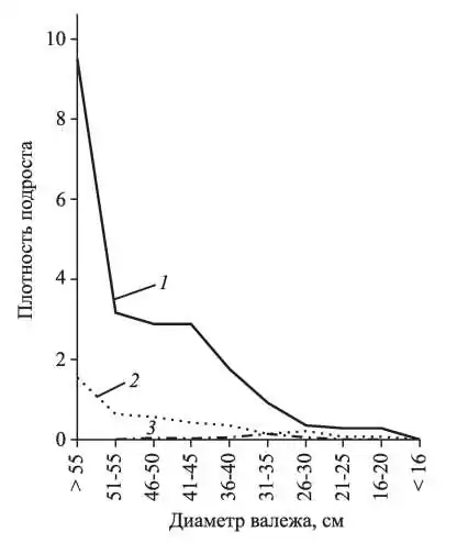 Зависимость плотности подроста (j-v) особей от диаметра валежа в малонарушенном темнохвойном лесу: 1 - подрост ели, 2 - подрост пихты; на 15-летней вырубке: 3 - подрост ели. Плотность рассчитана на 1 м длины валежа.