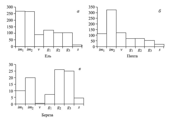 Усредненные возрастные спектры ели (а), пихты (б) и березы (в) по восьми постоянным пробным площадям в пределах массива малонарушенных темнохвойных лесов заповедника “Басеги”. На оси ординат - число особей на 1 га.