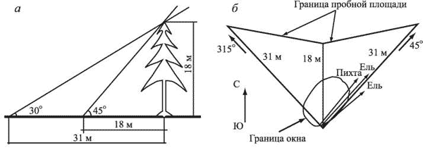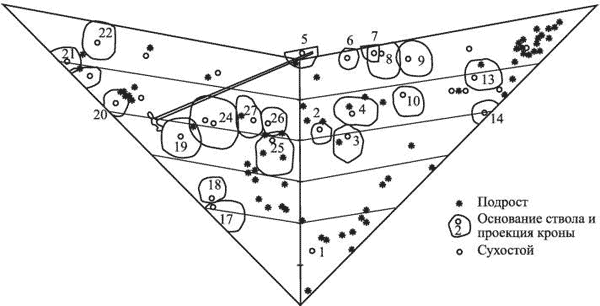 На пробной площади закартировано расположение деревьев и вертикальных проекций их крон, а также расположение подроста хвойных пород, высотой более 0,7 м.