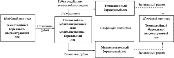 Схема сукцессий в бореальных лесах после сплошных рубок с сохранением напочвенного покрова.