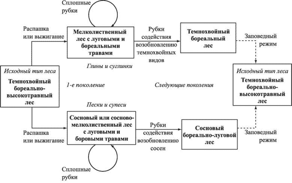 Схема сукцессий в бореальных лесах после распашек и/или выжиганий.
