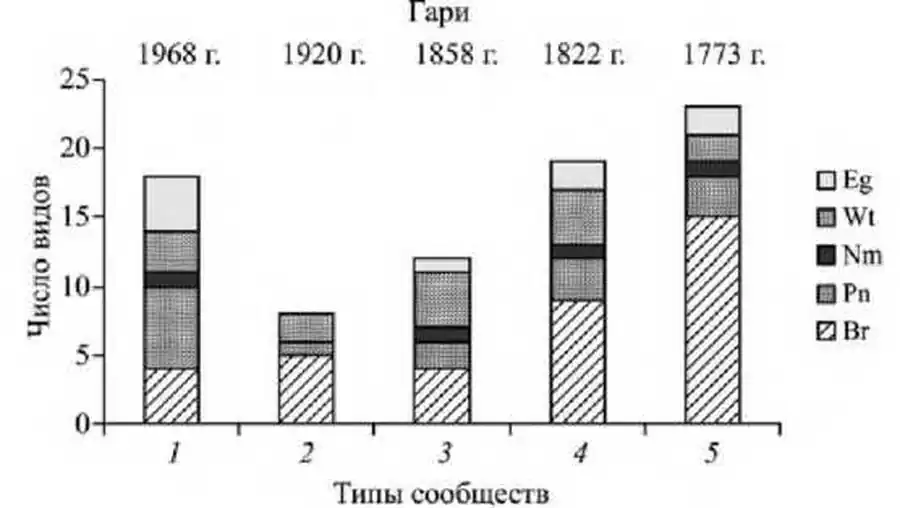 1 - сосняк вересковый лишайниковый по гари 1968 г., 2 - сосняк брусничный зеленомошно-лишайниковый по гари 1920 г., 3 - сосняк брусничный зеленомошно-лишайниковый по гари 1858 г., 4 - сосняк с елью черничный зеленомошный по гари 1822 г., 5 - ельник черничный зеленомошный по гари 1773 г.
