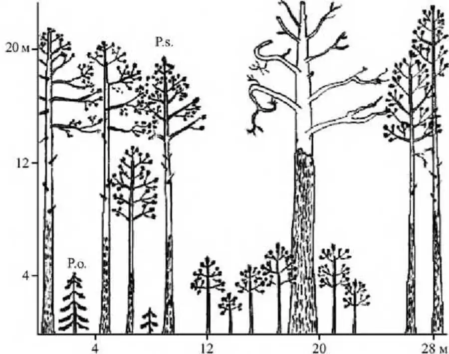 Вертикальная структура послепожарного сосняка, сформированного по гари 1858 года. Костомукшский заповедник, квартал 153.