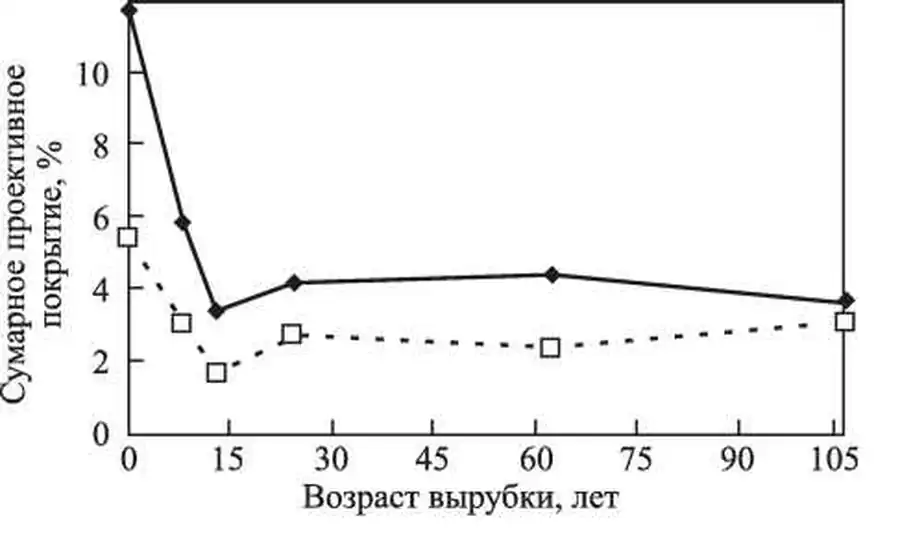 Изменение суммарного проективного покрытия видов таежного крупно-травья (полученное суммированием баллов по шкале Браун-Бланке для отдельных видов) в зависимости от возраста вырубки (сплошная линия) и то же - для трех фоновых видов - Dryopteris dilatata (Hoffm.) A. Gray, Athyrium filix-femina (L.) Roth и Aconitum septentrionale Koelle (штриховая линия).