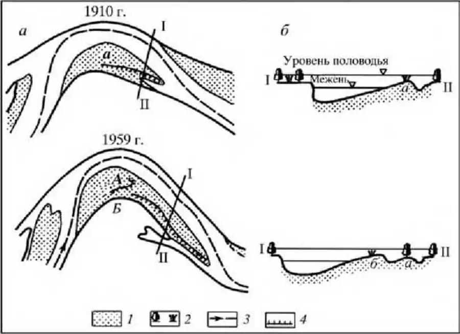 Условные обозначения: А, Б - последовательно причленившиеся побочни; 1 - прирусловые отмели; 2 - почвенно-растительный покров на пойме; 3 - положение динамической оси потока; 4 - подвалья крупных гряд (крутые склоны со стороны, где нет намыва).