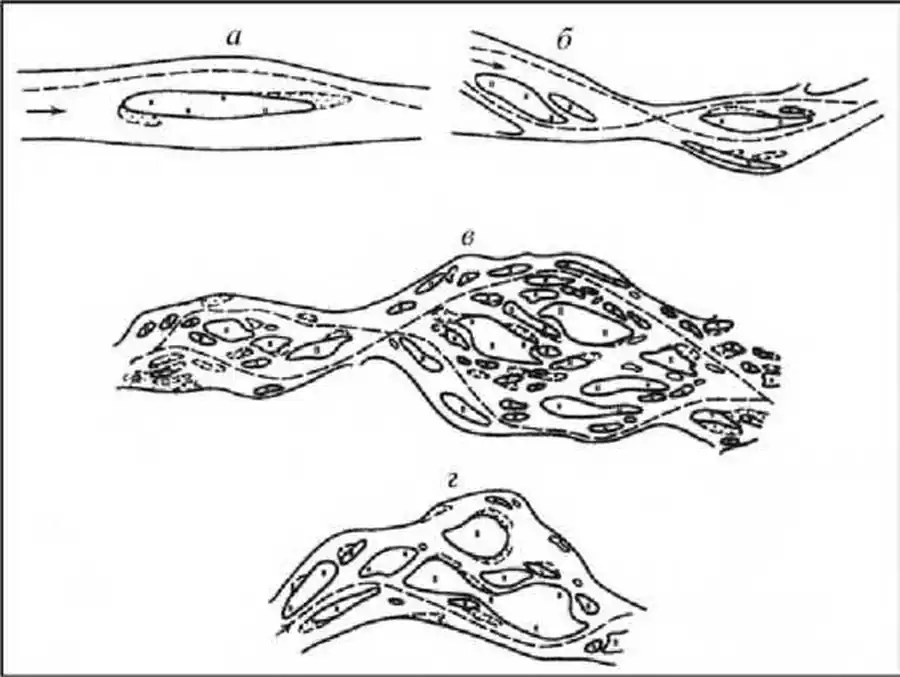 а - одиночное разветвление (верхняя Лена); б - простое сопряженное разветвление (средняя Обь); в - сложное сопряженное разветвление (нижняя Лена); г - разбросанное многорукавное русло (Киренга), (Чалов, 1979).
