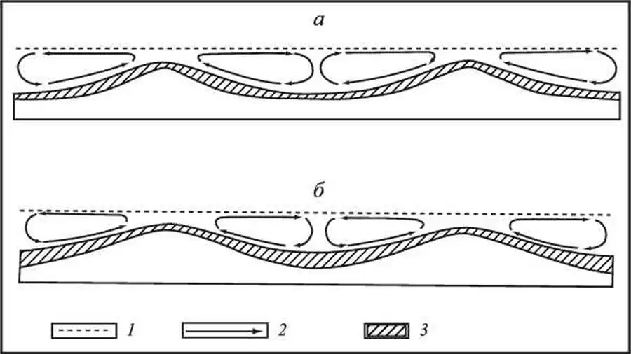 Схема накопления наилка на гривистой пойме под влиянием поперечной циркуляции полых вод (Шанцер, 1951): а - при умеренных скоростях течения, б - при очень малых скоростях течения (максимальное накопление в межгривных ложбинах).