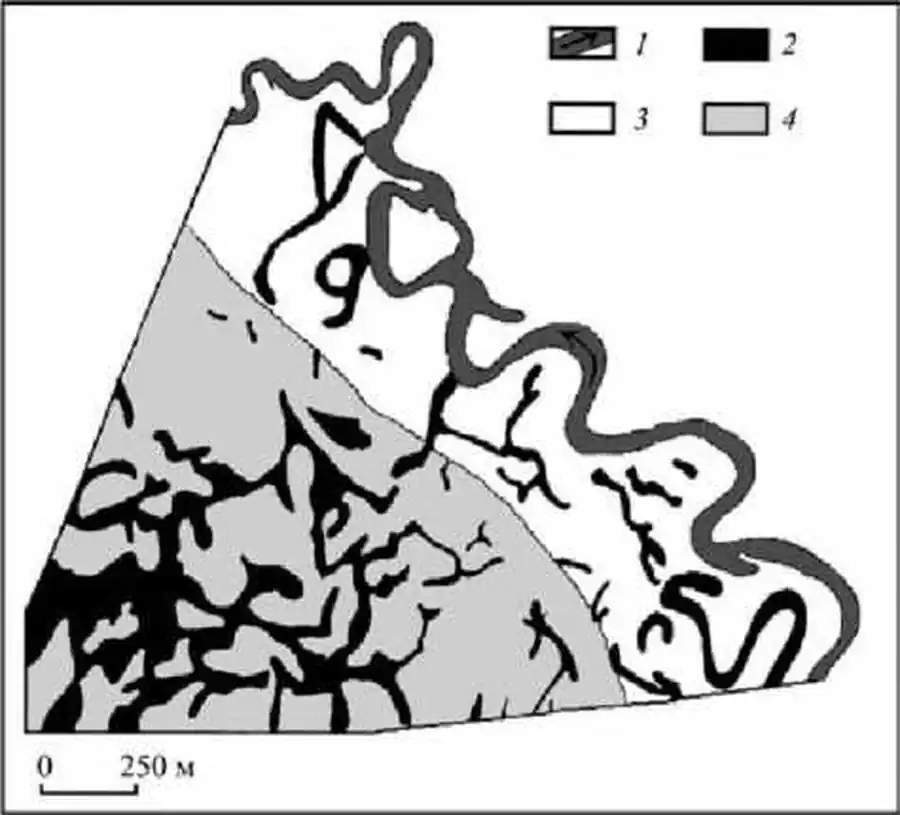 Условные обозначения: 1 - русло и направление течения в нем, 2 - межгривные и старинные ложбины, 3 - зона переработанной поймы, 4 - зона унаследованной поймы.