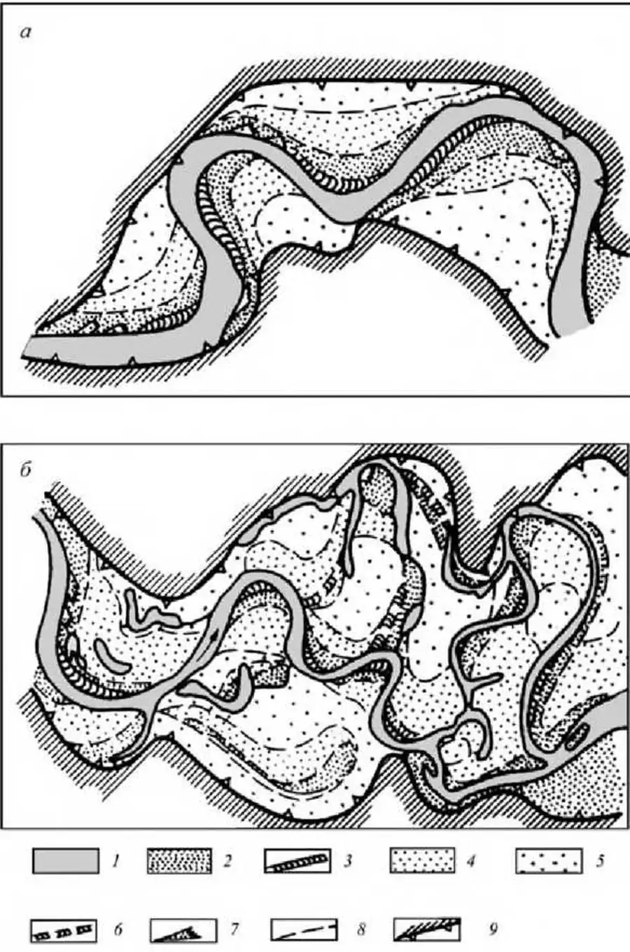 Условные обозначения: 1 - русло и направление течения; старинные озера; 2, 3 - молодые участки в прирусловой зоне (3 - наложенные прирусловые валы); 4, 5 - старые участки в центральной и притеррасной зонах, 6 - реликтовые наложенные прирусловые валы; 7 - языковидные выбросы песка, 8 - границы зон, 9 - уступы пойменных террас.
