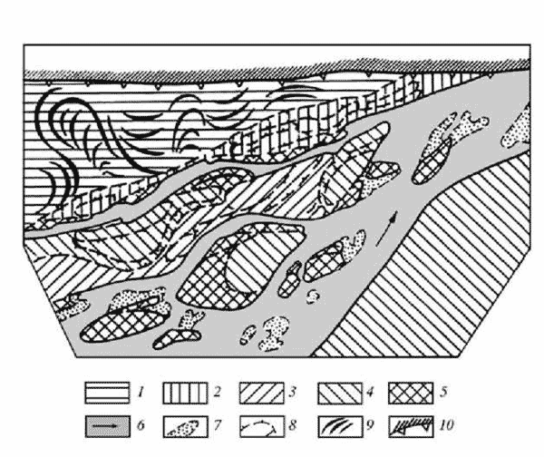 Условные обозначения. Пойменные ступени: 1 - пятая (высота над уровнем воды в межень - 10-12 м); 2 - четвертая (8-10 м); 3 - третья (6-8 м); 4 - вторая (3-6 м) и нерасчлененная пойма правого берега; 5 - формирующаяся в современном русле молодая пойма (0-4 м), 6 - русло и направление течения в нем; 7 - побочни перекатов; 8 - уступы на пойме, ограничивающие ступени и более мелкие гряды внутри ступеней; 9 - пойменные гривы; 10 - уступ надпойменной террасы.