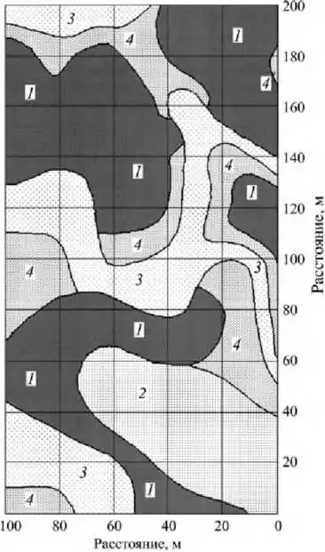 Условные обозначения: 1 - широколиственный лес, ассоциация Aceri campestris-Quercetum roboris, на краткопоемных верхних участках пойменных массивов, 2 - широколиственный лес, ассоциация Ficario-Ulmetum, на среднепоемных склоновых участках массивов, 3 - широколиственный лес, ассоциация Circaeo-Alnetum, на среднепоемных краевых участках массивов, 4 - травяная растительность, класс Phragmiti-Magnocaricetea, в долгопоемных ложбинах.