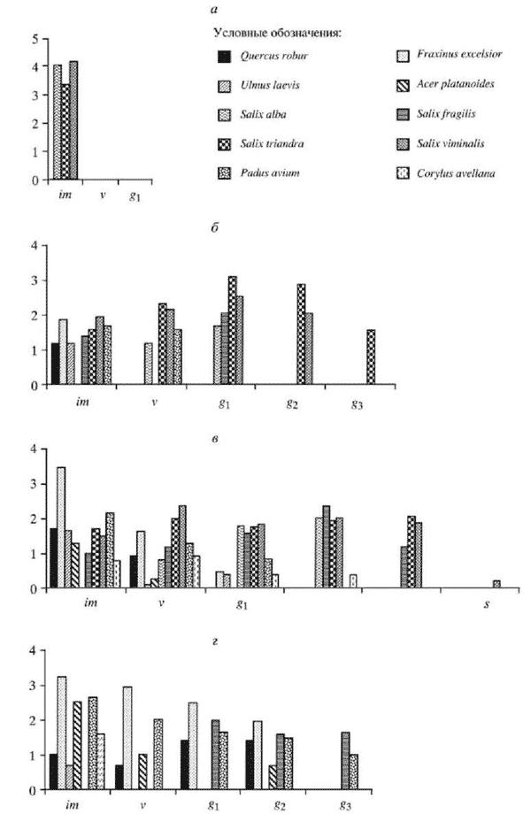 а- в травяной растительности на долгопоемных прирусловых отмелях (кл. Bidentetea tripar titi), б - в формирующихся ивняках на долгопоемных прирусловых гривах (асс. Salicetum triandro-viminalis), в - в старых ивняках на долгопоемных прирусловых гривах (асс. Salicetum triandro-viminalis), г - в лесах на отстоящих от русла среднепоемных гривах (переход от асс. Salicetum albae к асс. Ficario-Ulmetum).