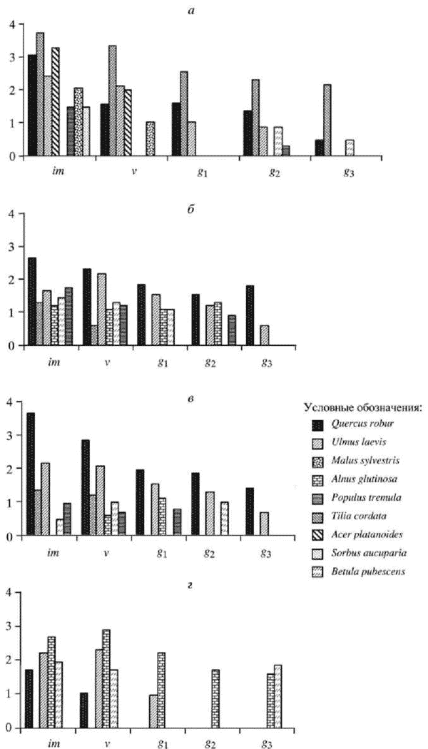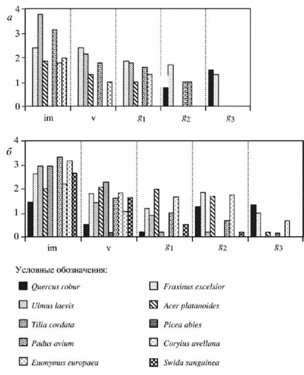 Демографическая структура популяций древесных видов в малонарушенных лесах унаследованной поймы (зона широколиственных лесов, река Нерусса): а - на среднепоемных гривах (acc. Ficario-Ulmetum), б - на краткопоемных гривах (acc. Aceri campestris-Quercetum roboris).