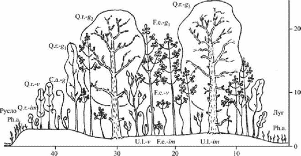 Виды растений: Q.r. - дуб черешчатый, F.e. - ясень обыкновенный, U.L - вяз гладкий, С.а. - лещина обыкновенная, Ph.a. - канареечник тростниковидный; im, v, g2, g3 - индексы онтогенетических состояний. Глубина профиля 5 м. По вертикали - высота (м), по горизонтали - протяженность профиля (м).