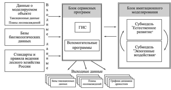 Он состоит из модели естественного развития, модели экзогенных воздействий (в том числе и лесохозяйственных) и набора сервисных программ (программ преобразования входной информации к формату моделей, ГИС, справочных баз данных, программ преобразования и отображения выходной информации и т.д.).