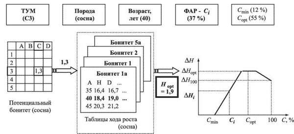 По таблице потенциальных бонитетов определяется значение потенциального бонитета сосны в типе условий местопроизрастания СЗ, далее по таблицам хода роста определяется прирост сосны заданного бонитета, который наблюдается при оптимальной освещенности. По кривой зависимости прироста от освещенности (ФАР) определяется прирост сосны при заданном значении освещенности.