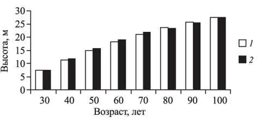 1 - средняя высота деревьев разного возраста, полученная по таблицам хода роста смешанных елово-березовых насаждений; 2 - средняя высота деревьев разного возраста, рассчитанная в результате моделирования.