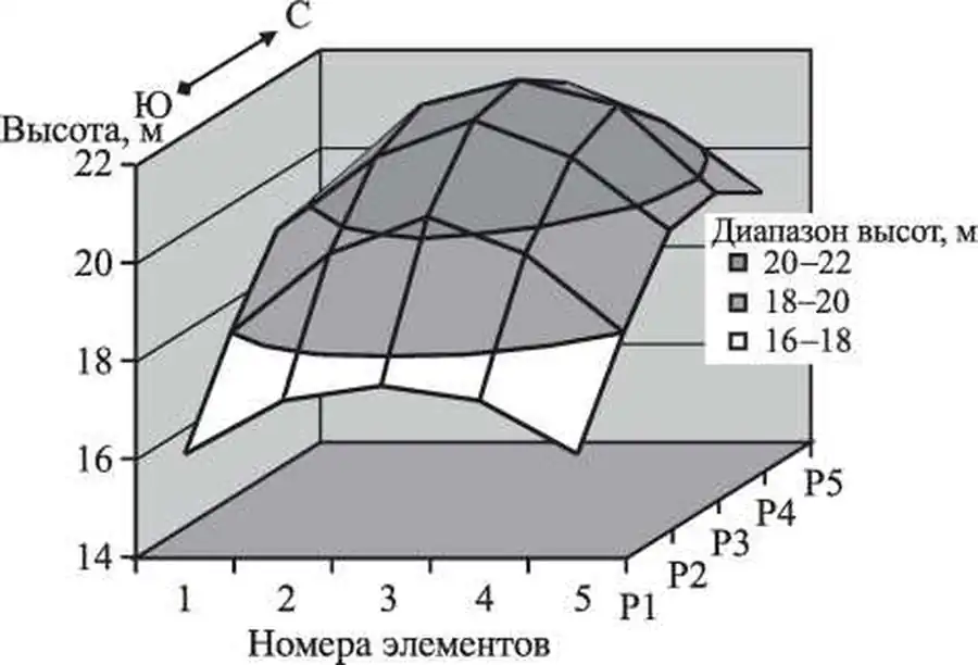 Вторая серия экспериментов демонстрирует влияние окружающего древостоя на развитие культур. Например, в окне котловинной рубки размером 270 кв.м за 60 лет культуры дуба достигают высоты 16 м, т.е. отклонение значений, полученных для сравниваемых серий компьютерных экспериментов составляет на 6,1 м меньшее, чем в первой серии (или 38%). Эксперименты с моделированием разных размеров котловинных рубок (от 270 кв.м до 2500 кв.м), лесосек разной ширины (от 16 м до 80 м) и направления (Север-Юг, Запад-Восток) показали, что с увеличением размеров вырубки влияние окружающего насаждения на рост культур уменьшается. На рис. 10.7 показана зависимость высоты 60-летнего дуба от положения в окне, полученная в результате моделирования котловинной рубки размером 83,5 м х 83,5 м (5 элементов х 5 элементов). В этом случае высота дуба в разных частях окна изменяется от 16 до 22 м, причем высота дуба в южной части окна намного меньше его высоты в центральной и северной частях окна, что связано с затенением от полога леса, окружающего окно.
