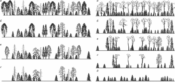 а - исходное насаждение (слева - разновозрастный ельник с примесью лиственных пород, справа - двухъярусное сосновое насаждение, образованное двумя поколениями сосны, с обильным подростом ели); б - добровольно-выборочная рубка (при рубке оставлены “на корню” наиболее здоровые и перспективные для дальнейшего роста деревья); в - подневольно-выборочная рубка (вырублены все деревья больше определенного диаметра, кроме тех, что не имеют спроса - лиственных пород и поврежденных или сухостойных хвойных); г - условно-сплошная рубка (вырублены все деревья, кроме не имеющих спроса; отличается от подневольно-выборочной только интенсивностью рубки); д - сплошная рубка с сохранением подроста.