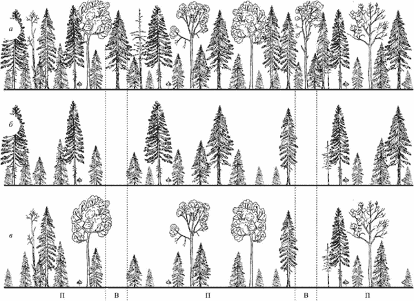 Схема проведения выборочной рубки главного пользования в смешанном елово-осиновом насаждении (а) в соответствии с действующими нормативами и практикой проведения (б) и в соответствии с рекомендациями настоящей статьи (в). Буквами внизу обозначены: В - волока и П - пасеки.